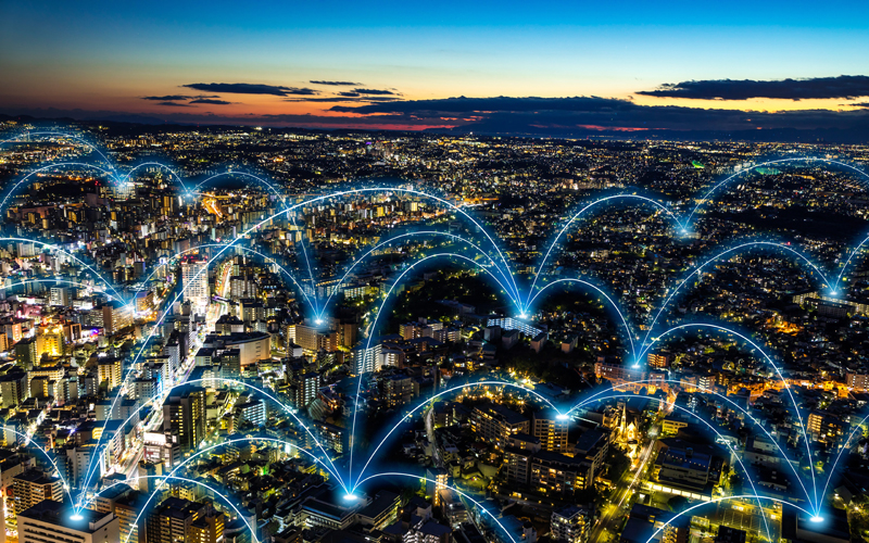 Buildings connected by beams of light